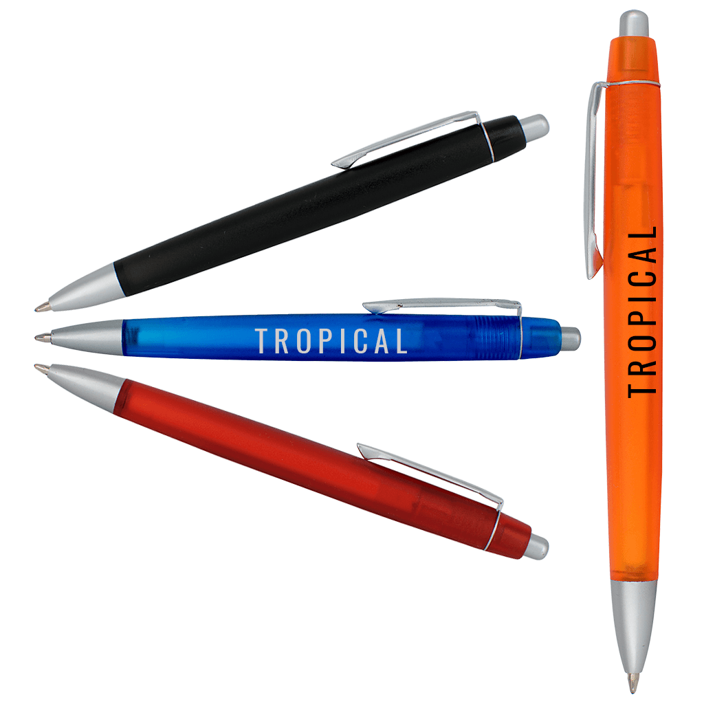 This beautiful frosted retractable customizable pen comes with Pewter trim. Seven brilliant colors are available, including blue, red, orange and smoke. These bulk promo pens from PensXpress make a great choice for large orders. Best of all, you can customize your pens to fit your business needs. Whether advertising your company or promoting an event, these pens are a great selection.